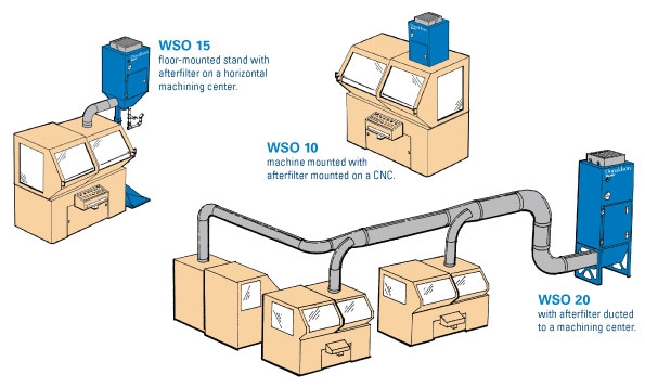 WSO主要優點有:1. WSO油霧過濾器可以滿足各種設備的安裝要求:可安裝在機頂、地面或連接中央管道系統,如下圖: